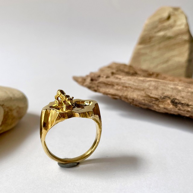 【ストーリー / Story】 サバンナの厳しい環境の中で見つけた小さなオアシス。 A small oasis found in the harsh savanna. 水面に顔を近づけて水を飲もうとするメスライオンを、ちいさくちいさく作りました。 A lioness bends down to drink from the shimmering surface of the water, captured in miniature form. 爪の先ほどの大きさですが、かがんだ姿勢や小さな尻尾、耳まで丁寧に造形しています。 Though only the size of a fingertip, every curve—from her crouched pose to her tail and ears—is carefully sculpted. 小さな池は実際にくぼんでいて、水をためて遊ぶこともできます。 The small pond is slightly recessed—you can even fill it with a drop of water and play. 遊んだあとはしっかりと水気をふきとって保管してくださいね。 After playing, please be sure to wipe away any moisture before storing. サバンナでの一瞬の情景を閉じ込めた、物語のある一点物のリングです。 This is a one-of-a-kind art ring that captures a fleeting moment on the savanna. 動物やユニークなデザインを愛する方におすすめです。 Perfect for those who love animals and distinctive designs. -------------------------------------------------- 【お取り扱いについて / Handling Notes】 こちらのアイテムは「見て楽しむジュエリー」です。 もちろん着用も可能ですが、そのデザインゆえに様々なものに引っかかる恐れがあります。 着用の際は、周囲やご自身に怪我のないよう十分ご注意ください。 また、繊細な作りとなっておりますので、お取り扱いにもご注意ください。 This piece is designed primarily as art jewelry to be admired. It can be worn, but due to its intricate form, it may snag on clothing or objects. Please handle with care and avoid injury to yourself or damage to the piece. The design is delicate—treat it gently. 【サイズ・素材 / Size & Material】 素材:真鍮 サイズ:約15号(H26×W21×D15mm) サイズ直し:±2〜3号可能 ※サイズ調整後、ロウ付け箇所が経年変化によってうっすら見える場合がありますが、 お手入れ用クロスで磨くと目立たなくなります。 Material: Brass Size: JP #15 (approx. H26×W21×D15mm) Resizing: ±2–3 sizes available After resizing, solder marks may appear slightly over time, but can be polished off with a jewelry cloth. 【その他 / Notes】 ご利用の環境により、色味が実物と異なって見える場合があります。ご了承ください。 Please note: colors may appear slightly different depending on your display settings.