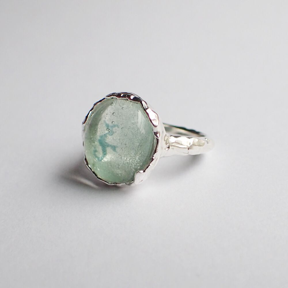 海底の岩場やサンゴ礁をイメージさせるぼこぼこしたリングとガラスのツルンとした質感の対比を楽しめるデザインにしました。